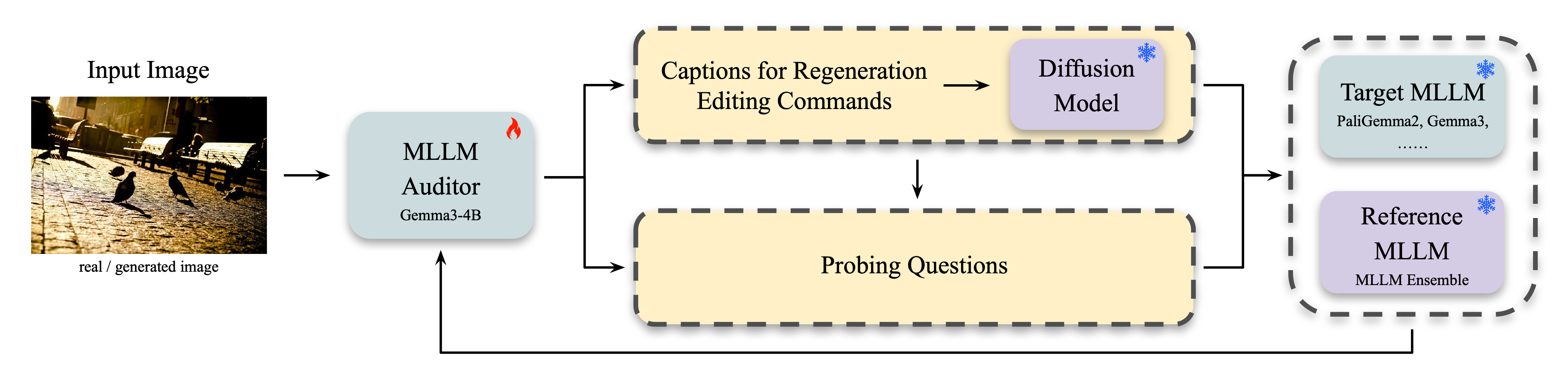 AuditDM fine-tunes an MLLM into an auditor that generates challenging probing questions and counterfactual images (via captions for image regeneration or editing commands), yielding question–image pairs on which the target model fails while the MLLM ensemble agrees, thus exposing capability gaps and failure modes. The auditor is trained to maximize prediction discrepancy between the target and the ensemble. Once trained, it identifies weaknesses and failure cases in a single inference pass.