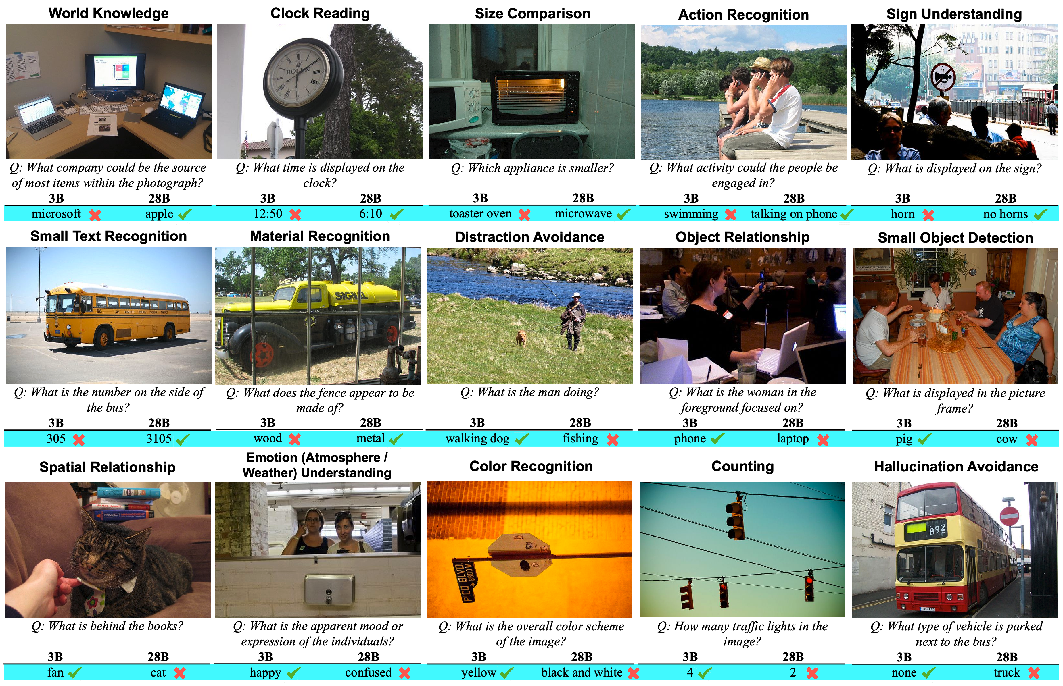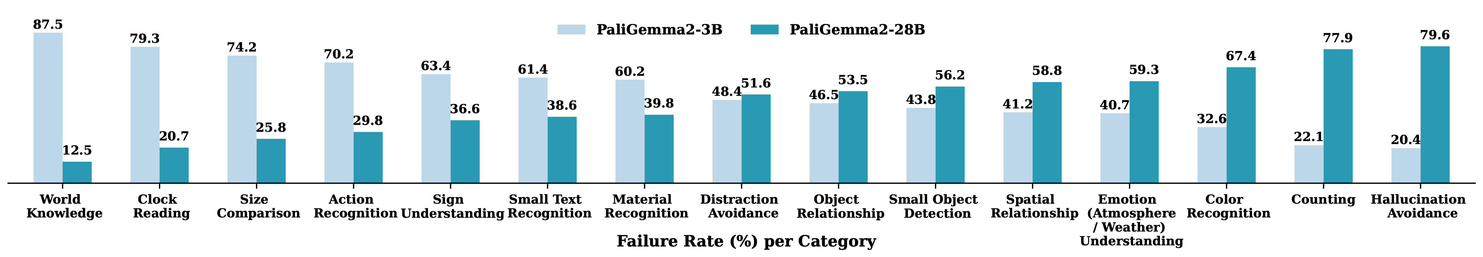 | AuditDM identifies the top 15 failure modes and challenging task categories for PaliGemma2-3B and 28B models at 448x448, and we report normalized per-category failure rates. Tasks are ordered left to right, beginning with the most pronounced weaknesses of the 3B model and progressing to those of the 28B. Notably, we observe that for certain tasks, the 28B model performs significantly worse than the 3B model. For example, on challenging images, the 28B model struggles more with color recognition and counting, and is more prone to hallucination |