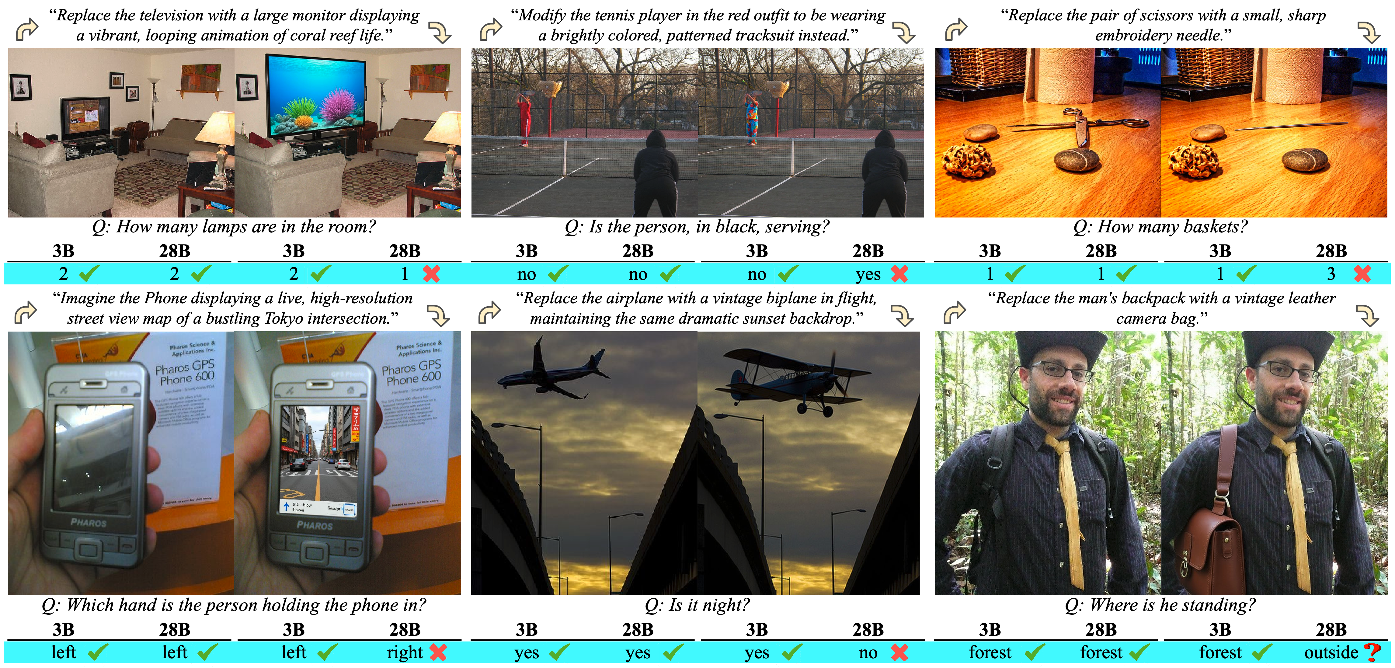 | AuditDM efficiently detects fine-grained visual cues that are irrelevant to the task/question yet still alter model predictions. We target PaliGemma2-28B (448x448) and showcase small modifications that fool the 28B model but not the 3B model, highlighting the effectiveness of our method in finding failures even in very powerful models. For each example, we show the original image (left), the modified image (right), and the corresponding answers. Our analysis shows that even the PaliGemma-2 28B model is highly sensitive to minor changes in task-irrelevant objects, suggesting that current MLLMs may still fail to ground visual reasoning in the correct evidence. |